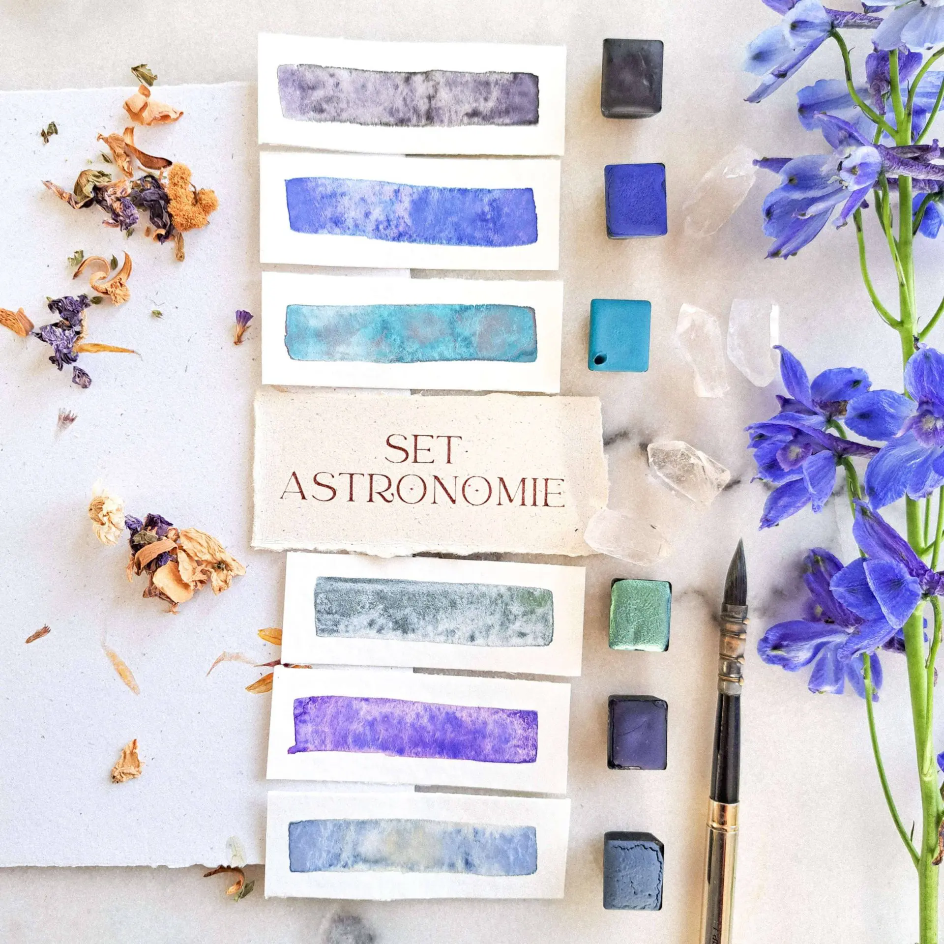 Les pigments sont sélectionnés et broyés avec soin dans mon atelier de manière artisanale (une vitre et une molette en verre) avec un liant d’origine végétale. La mixture et les pigments ne contiennent aucun produit d’origine animal.