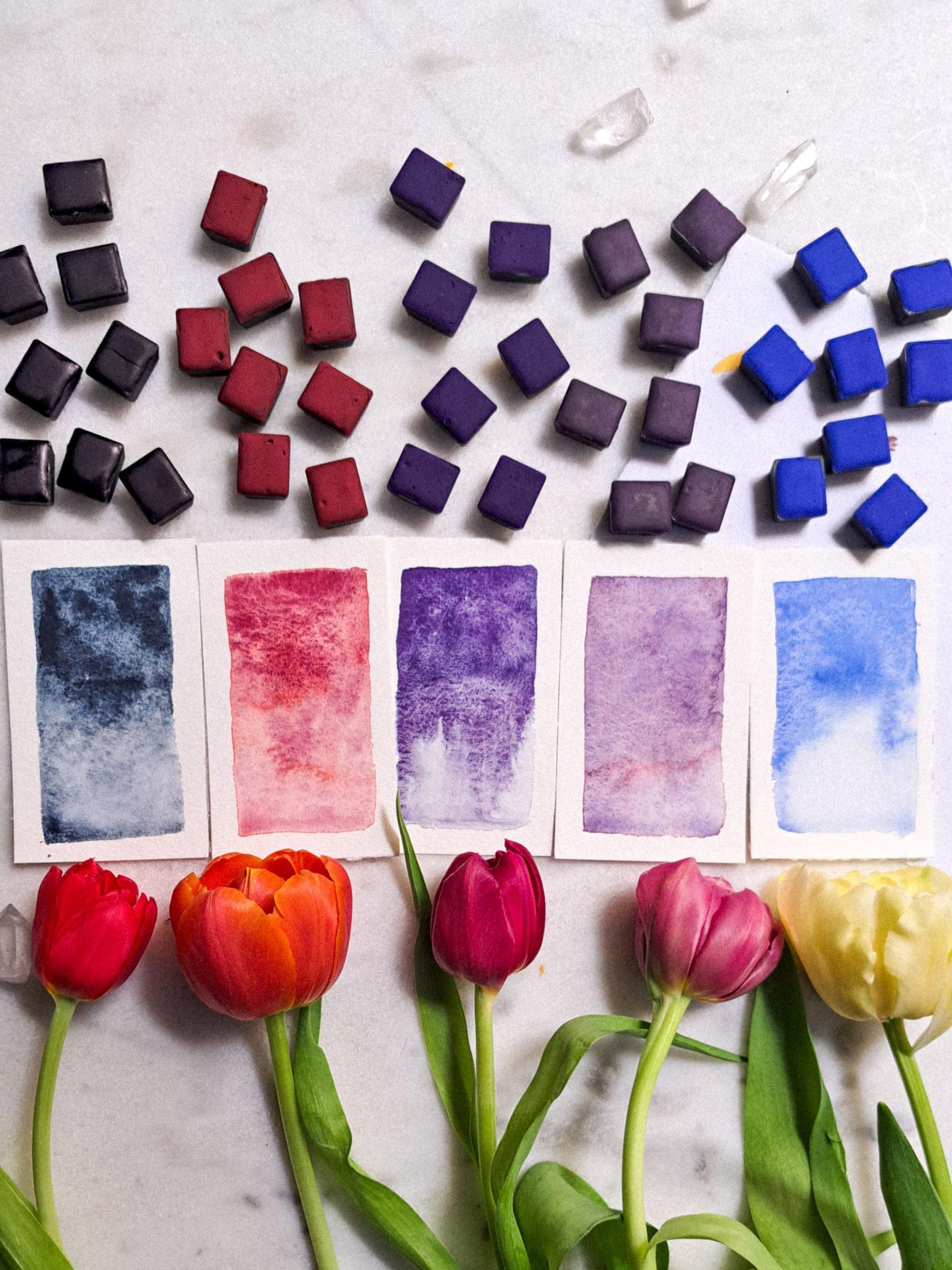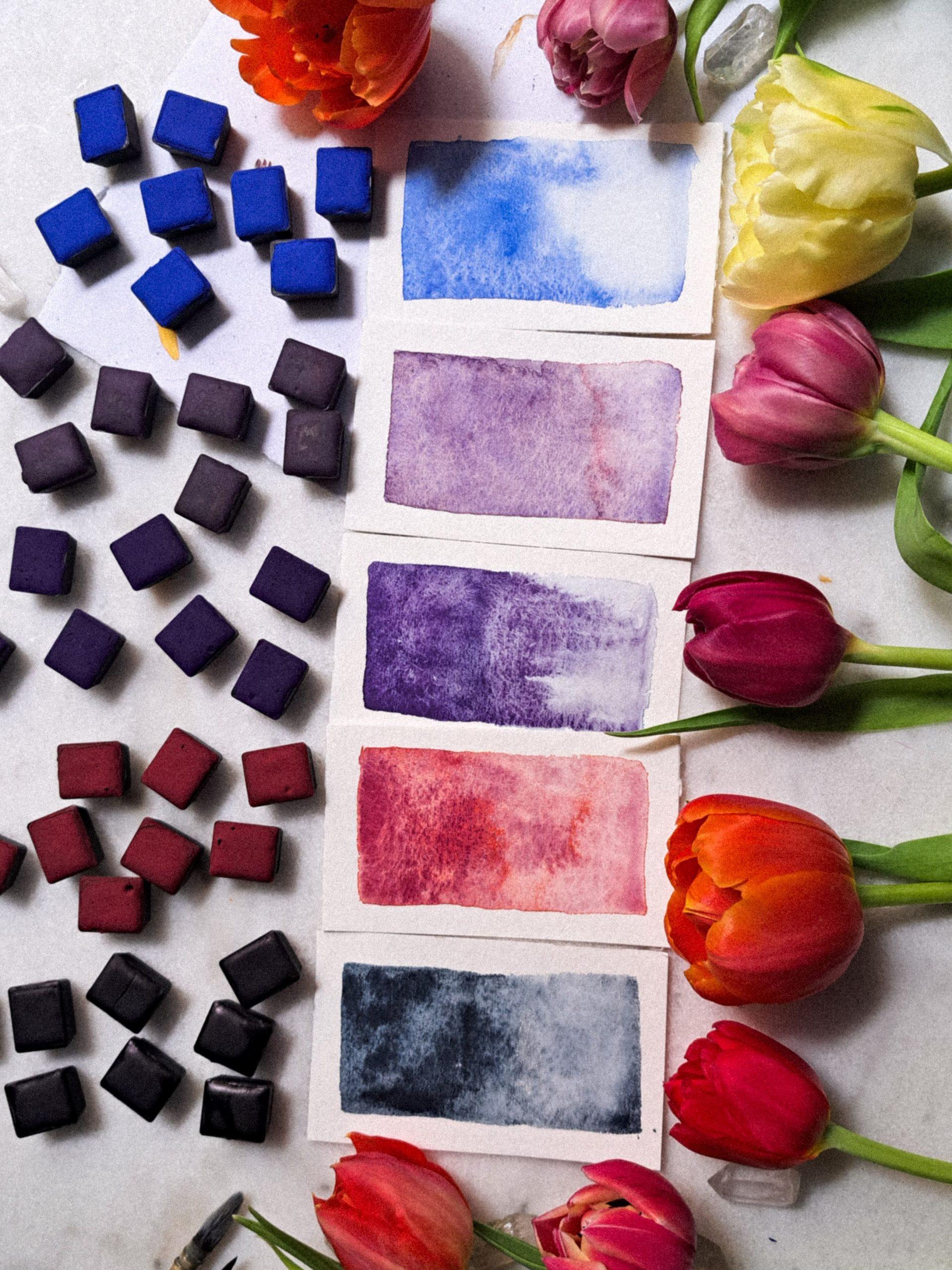 Set aquarelle composé de 5 couleurs dont certaines duochromes et granuleuses : Encre, Gris de payne, Manga, Cire & Myrtille.