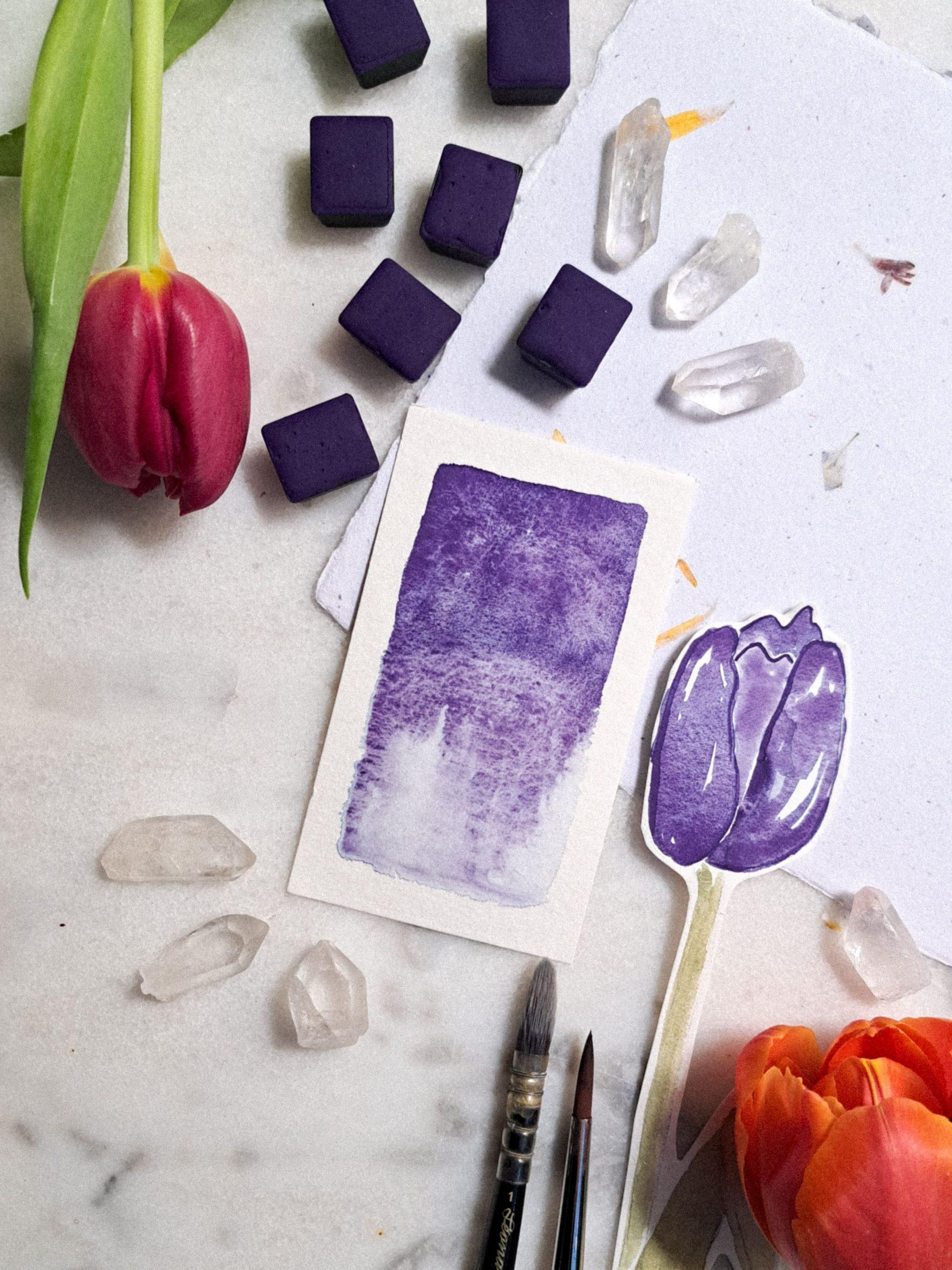 Pour les teintes granuleuses ou aux effets duochromes, il est recommandé d’humidifier généreusement le papier avant de peindre. Laissez le temps au pigment de se déposer et de révéler ses nuances naturelles : les séparations de couleurs apparaissent au séchage, créant des contrastes et des textures uniques.